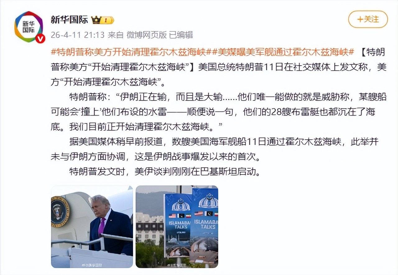 美国总统特朗普11日在社交媒体上发文称,美方“开始清理霍尔木兹海峡”。